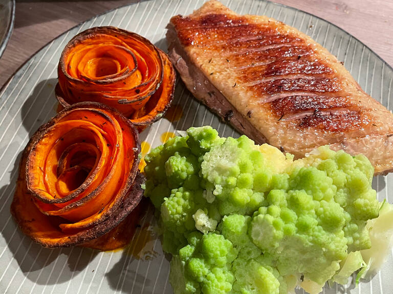 Entenbrust SousVide mit ApfelRotkohl und MacaireKartoffeln Mehr Genuss