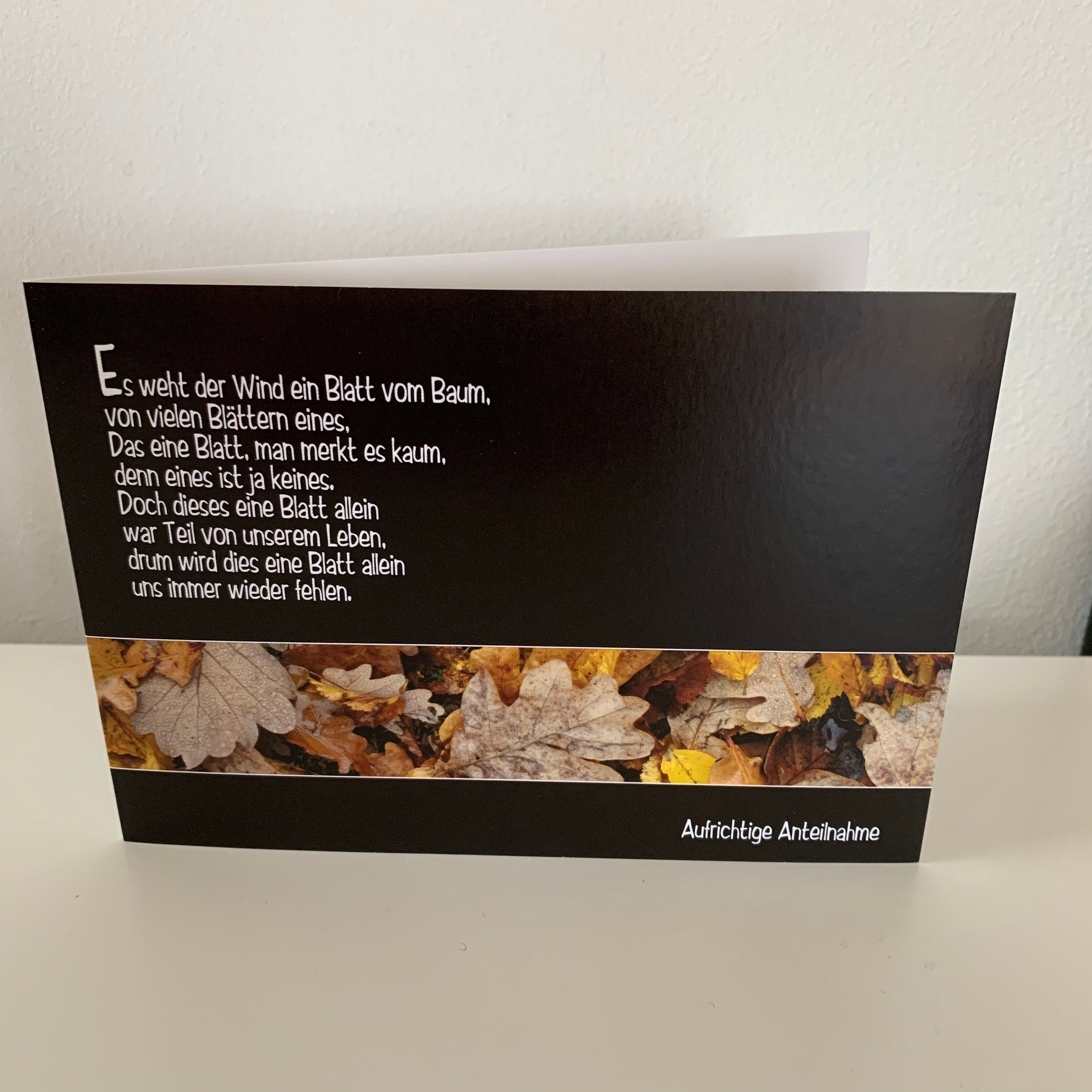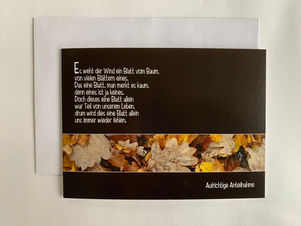 Produktinformationen zu "Es weht der Wind ein Blatt vom Baum". Trauerkarte: Es weht der Wind ein Blatt vom Baum, von vielen Blättern eines, dies eine Blatt, man merkt es kaum, denn eines ist ja keines. Doch dieses Blatt allein, war Teil von unserem Leben, darum wird dieses Blatt allein, uns immer wieder fehlen. Aufrichtiges Beileid.