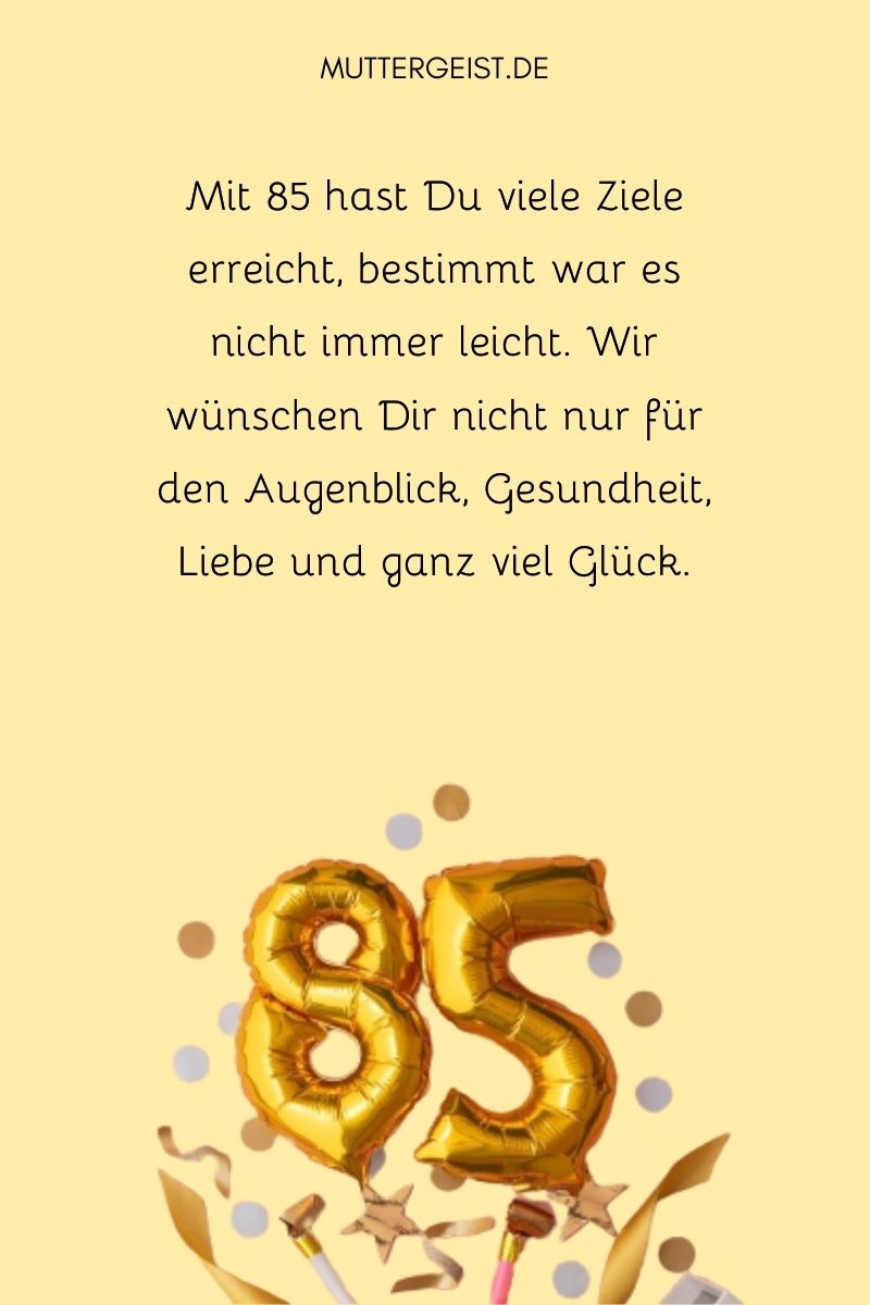 1. 85 Jahre auf der Welt, das kann man nicht bezahlen, nicht mit noch so viel Geld. 85 Jahre sind es deshalb wert, dass man sie feiert, wie es sich gehört. Mit achtvollem Respekt und dir zu Ehren soll dieser Tag nur dir gehören. Die allerbesten Glückwünsche nur für dich, wir gratulieren ganz herzlich! Link kopieren und in Hompage einbetten. 2.
