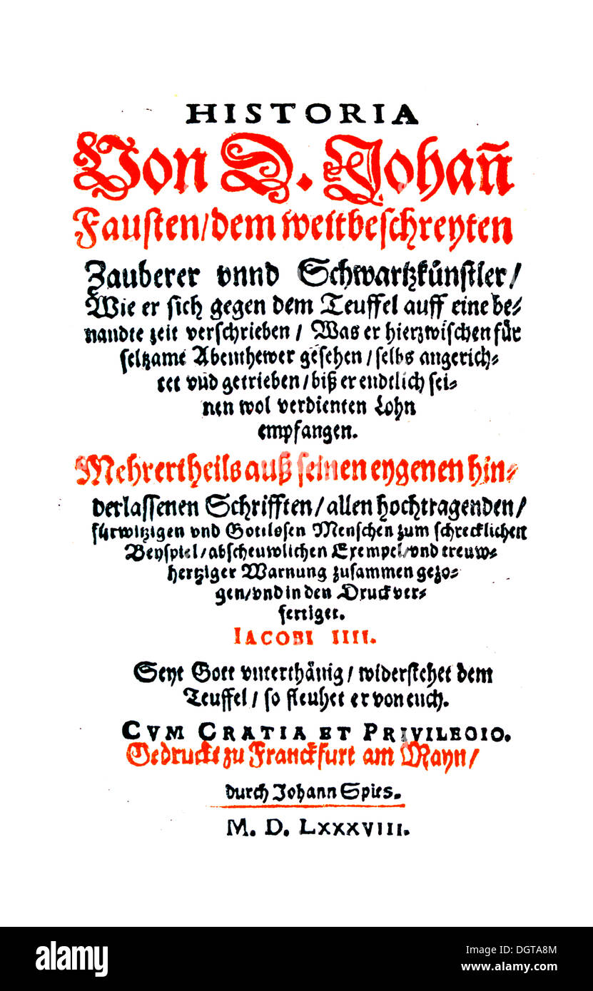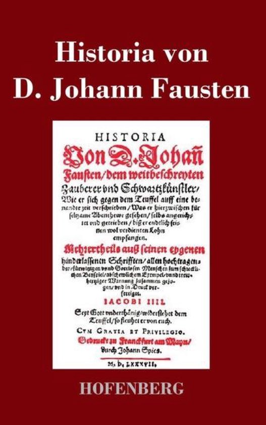 Historia von D. Johann Fausten, the first "Faust book", is a chapbook of stories concerning the life of Johann Georg Faust, written by an anonymous German author. It was published by Johann Spies (1540-1623) in Frankfurt am Main in 1587, and became the main source for the play The Tragical History of Doctor Faustus by Christopher Marlowe and Goethe's closet play Faust, and also served as the.