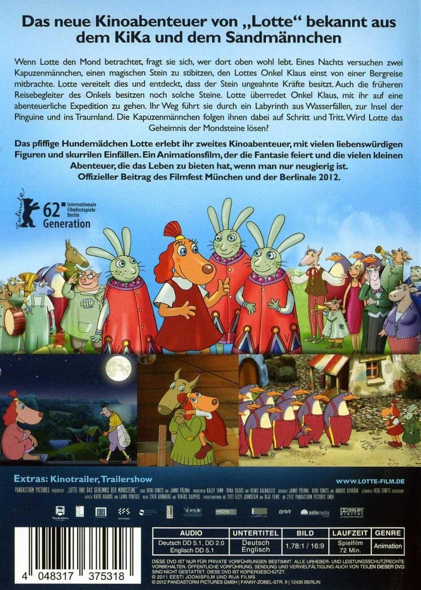 Kritik zu Lotte und das Geheimnis der Mondsteine | epd Film. © Pandastorm. Estland. Lettland. 2011. Original-Titel: Lotte ja kuukivi saladus. Filmstart in Deutschland: 20.09.2012. R: Heiki Ernits, Janno Põldma. B: Andrus Kivirähk, Heiki Ernits, Janno Põldma. P: Riina Sildos, Kalev Tamm. Sch: Janno Põldma. M: Sven Grünberg. V: Pandastorm. L: 75 Min.