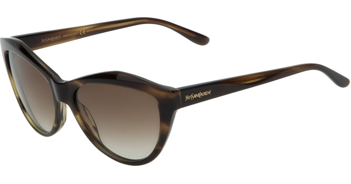 Shop Saint Laurent Eyewear cat-eye sunglasses. Womenswear.. cat-eye frame ; grey tinted lenses ; signature YSL logo plaque ; sculpted arms ; curved tips ; These glasses come with a protective case. Composition. Acetate 100%. Product IDs. FARFETCH ID: 22868610. Brand style ID: SLM94. Never miss a thing.