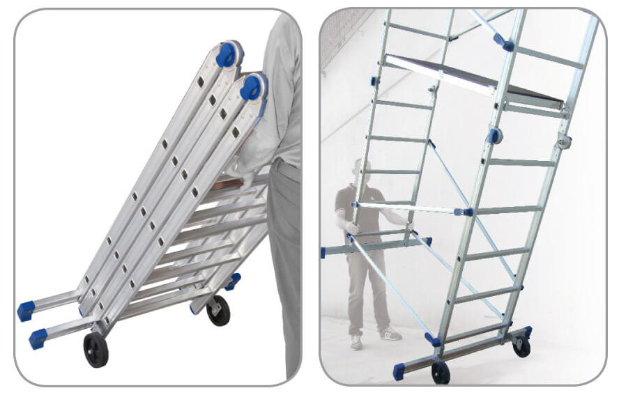 Leiter mit modulierbarem Podest kann als Anlegeleiter, Doppelleiter oder Gerüst verwendet werden.