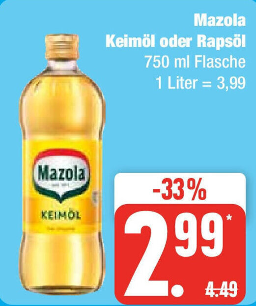 Mazola Keimöl oder Rapsöl 750 ml Flasche Angebot bei Edeka