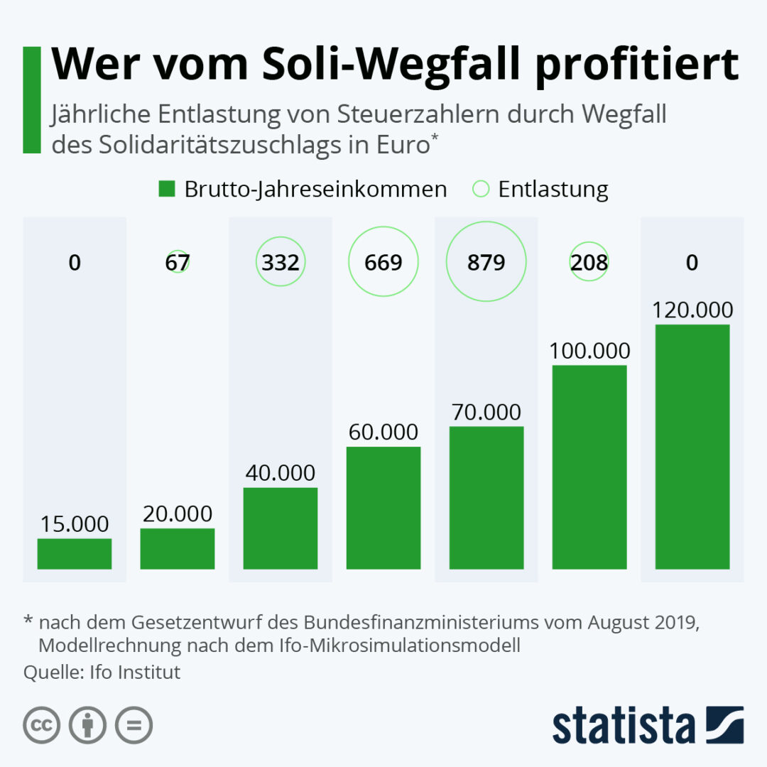Seit 2021 ist der Soli für rund 90 Prozent der Steuerzahler weggefallen. Für weitere 6,5 Prozent der Steuerzahler gilt: Der Soli ist in Stufen von bislang 5,5 Prozent auf 3,5 Prozent gesenkt worden. Einfache & schnelle Berechnung des Solidaritätszuschlag mit Steuersätzen auf den Euro genau. Jetzt Soli berechnen:
